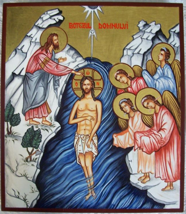 ”În vremea aceea a venit Iisus din Galileea la Iordan, către Ioan, ca să fie botezat de el. Ioan însă Îl oprea, zicând: Eu am trebuință să fiu botezat de Tine, și Tu vii la mine? Și răspunzând, Iisus a zis către el: Lasă acum, că așa se cuvine nouă să împlinim toată dreptatea. Atunci L-a lăsat. Iar după ce S-a botezat Iisus, în clipa când ieșea din apă, îndată cerurile s-au deschis și Ioan a văzut Duhul lui Dumnezeu pogorându-Se ca un porumbel și venind peste El. Și iată, un glas din ceruri care a zis: Acesta este Fiul Meu cel iubit întru Care am binevoit.” (Matei 3, 13-17)