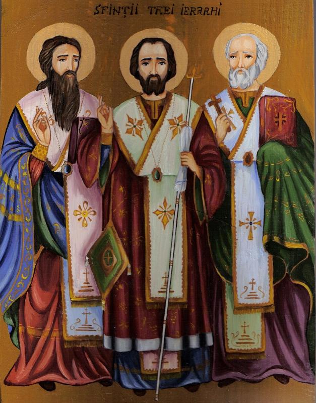 Astfel, ne-au învăţat să credem şi să mărturisim despre Sfânta Treime, cei trei preasfinţiţi arhiepiscopi; şi au întărit dogmele cele drepte cu învăţături preaînţelepte, în prigoane, primejdii şi războaie, până la moarte fiind prigoniţi, ba încă şi după moarte. Deci, adunaţi-vă toţi câţi v-aţi folosit de la dânşii, veniţi toată vârsta şi firea, bărbaţi şi femei, preoţi şi monahi, tineri şi bătrâni, să mulţumim făcătorilor noştri de bine, să lăudăm pe dascălii şi propovăduitorii bunei credinţe, să binecuvântăm cei săraci pe cei îmbogăţitori, cei din primejdii pe cei izbăvitori, cei cuvântători pe cuvântătorii de Dumnezeu, cei necăjiţi pe mângâietori, sărmanii pe părinţi, bolnavii pe doctori, străinii şi lipsiţii pe iubitorii de străini.